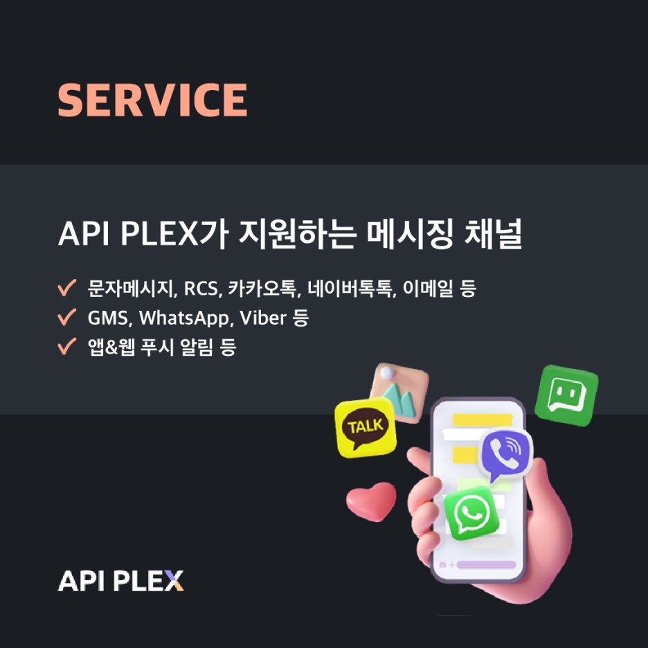 API PLEX에서는 국내외 다양한 메시징 채널들을 마음껏 이용하실 수 있습니다.